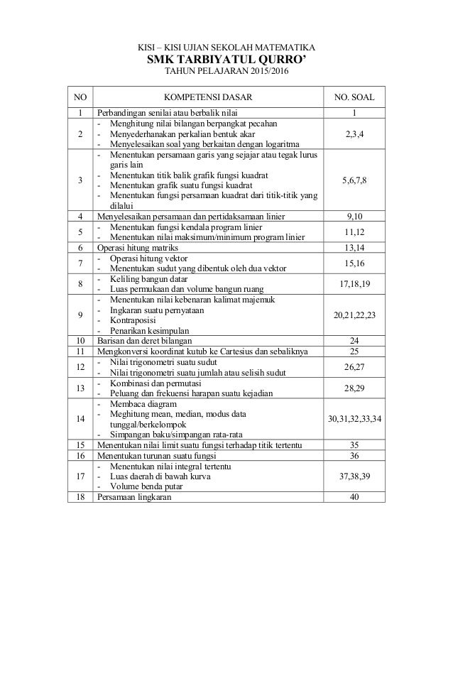 Kisi kisi un usbn 2019 smp sma smk | matematrick.com selamat datang bapak/ibu guru dan para pembaca di blog matematrick. Pembahasan soal uas bersama mtk teknik kelas xii des 14 by pak sukani in 2020 pie chart chart paks. Hayati yaryanispd n o standar kompetensi kompetensi dasar uraian materi indikator soal no soal 1 menggunakan logika matematika dalam pemecahan masalah yang berkaitan dengan pernyataan. 40 butir pilihan ganda standar kompetensi materi indikator indikator soal no. Kisi kisi soal unbk smk 2020 matematika pdf guru ilmu sosial.
